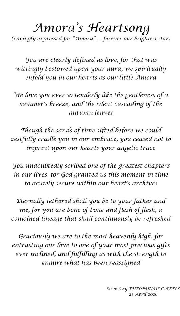 But even in this pain, we thank You for Amora, for her tiny hands, for her pretty toes, her quiet strength, and for the love she placed in our hearts We thank You for those precious moments You gave us to know her, and to love her. Though few, Those moments will live in us for the rest of our lives. Lord, we ask that you hold our baby girl closer than we ever could. When we ache to hear her cry, to feel her breathing against us, to see her smile be the one who comforts her in our place. Rock her when we cannot, sing to her when our voices fall silent, and let her feel the endless love we still have for her. Tell her, her mommy and daddy didn’t want to let her go and that we’re missing her every second. Lord, when we placed her in Your hands, that day a piece of our hearts went with her. Keep that piece safe. And please keep her safe, wrapped her in Your peace, where there is no pain, only light, and happiness.